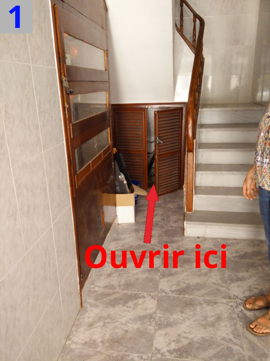 Photo n°1 : Le compteur d'eau avec la vanne d'ouverture se trouve en bas des escaliers sous les premières marches, ouvrir les deux petites portes, les compteurs sont derrière.