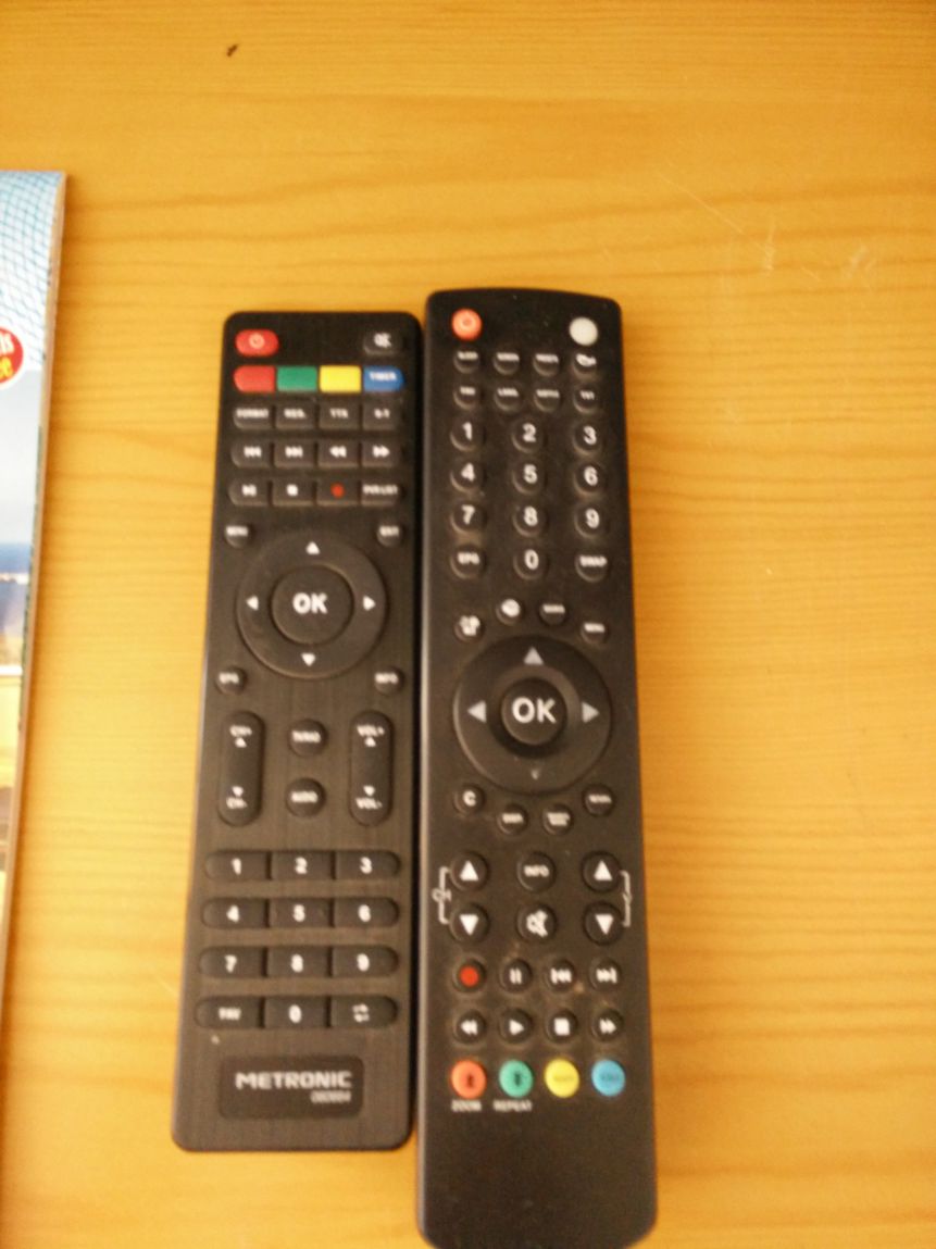 La télécommande de droite est la télécommande de la télévision, celle de gauche est celle du décodeur.